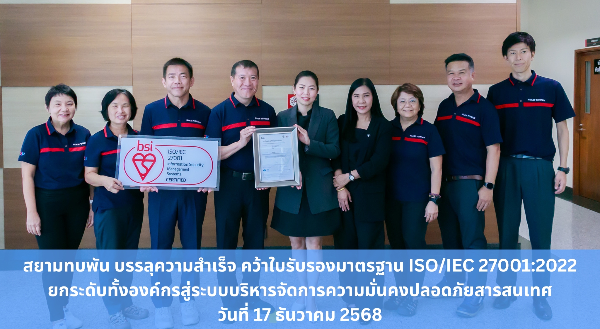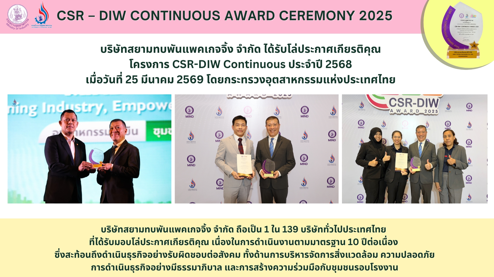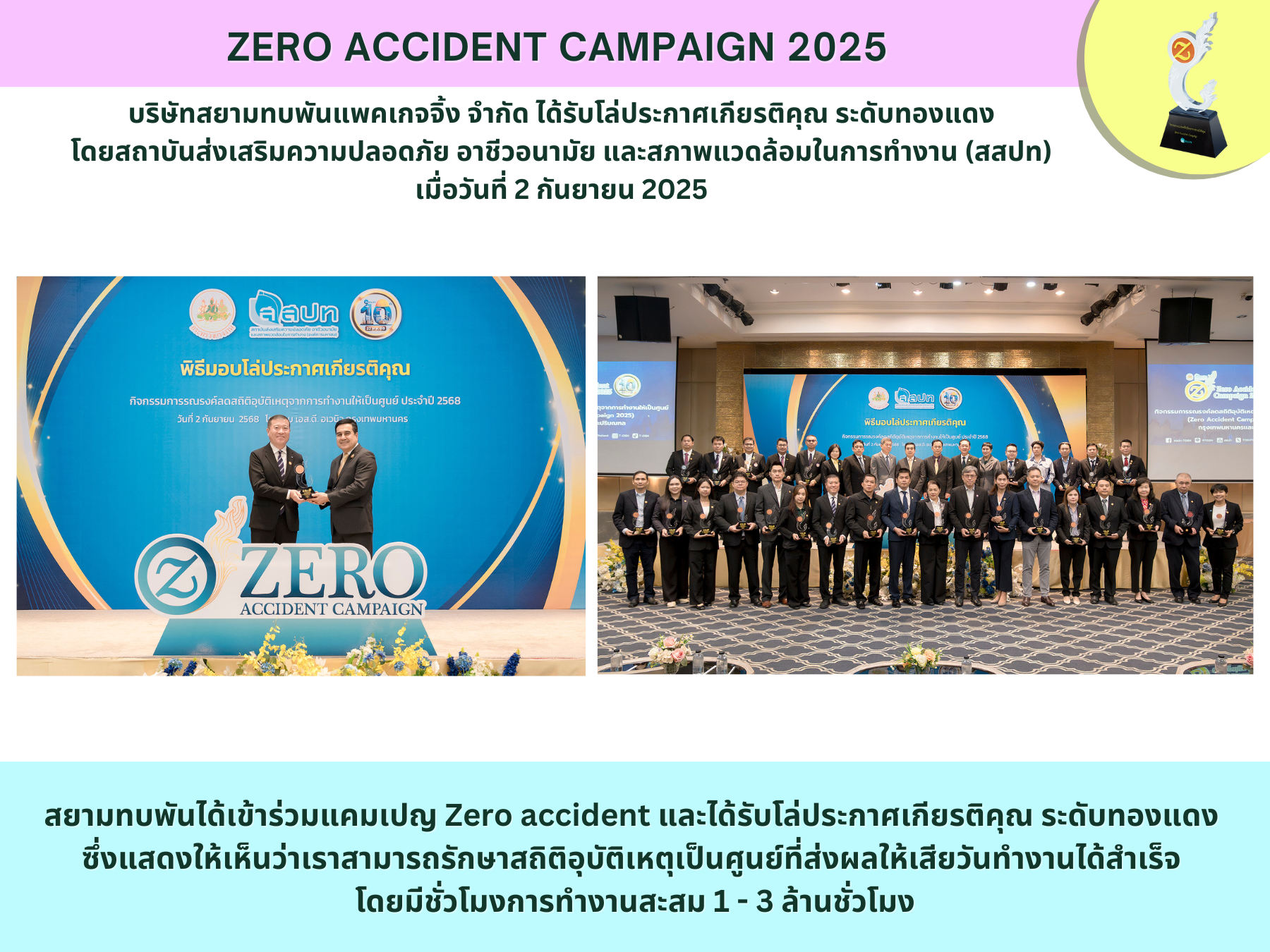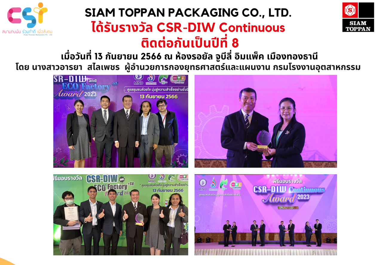 <span style="color:rgb(29, 33, 41); font-family:helvetica,arial,sans-serif; font-size:16px">บริษัทสยามทบพันแพคเกจจิ้ง จำกัด ได้เข้ารับรางวัล สถานประกอบกิจการต้นแบบดีเด่นด้านความปลอดภัย อาชีวอนามัยและสภาพแวดล้อมในการทำงานระดับประเทศติดต่อกัน 8 ปีระดับทอง ภายในงานสัปดาห์ความปลอดภัยในการทำงานแห่งชาติ ครั้งที่ 30 เมื่อวันที่30 มิถุนายน 2559 ณ ศูนย์แสดงนิทรรศการและการประชุมไบเทค บางนา กรุงเทพมหานคร รับมอบกับอธิบดีกรมสวัสดิการและคุ้มครองแรงงาน</span>
